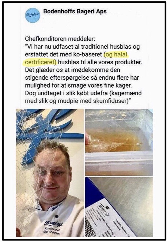 Den kendte bagerkæde Bodenhoff fortæller stolt på sociale medier, at kæden nu kan imødekomme den stigende efterspørgsel fra muslimer, der kræver halal-certificeret bagværk. (Se foto af den islamiske eid-kage, som konditorkæden stolt fremstiller. Kagen er naturligvis 100 procent halal.)