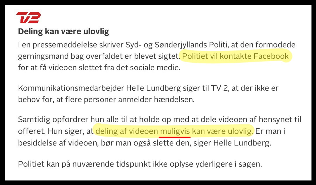 Derfor er det også mistænkeligt, at politiet nu slår usædvanligt hårdt ned på denne video. Den danske ordensmagt vil personligt kontakte Facebook for at få Facebook til at fjerne videoen. Politiet er nu blevet en udøvende magt, der medvirker til censur på sociale medier.
