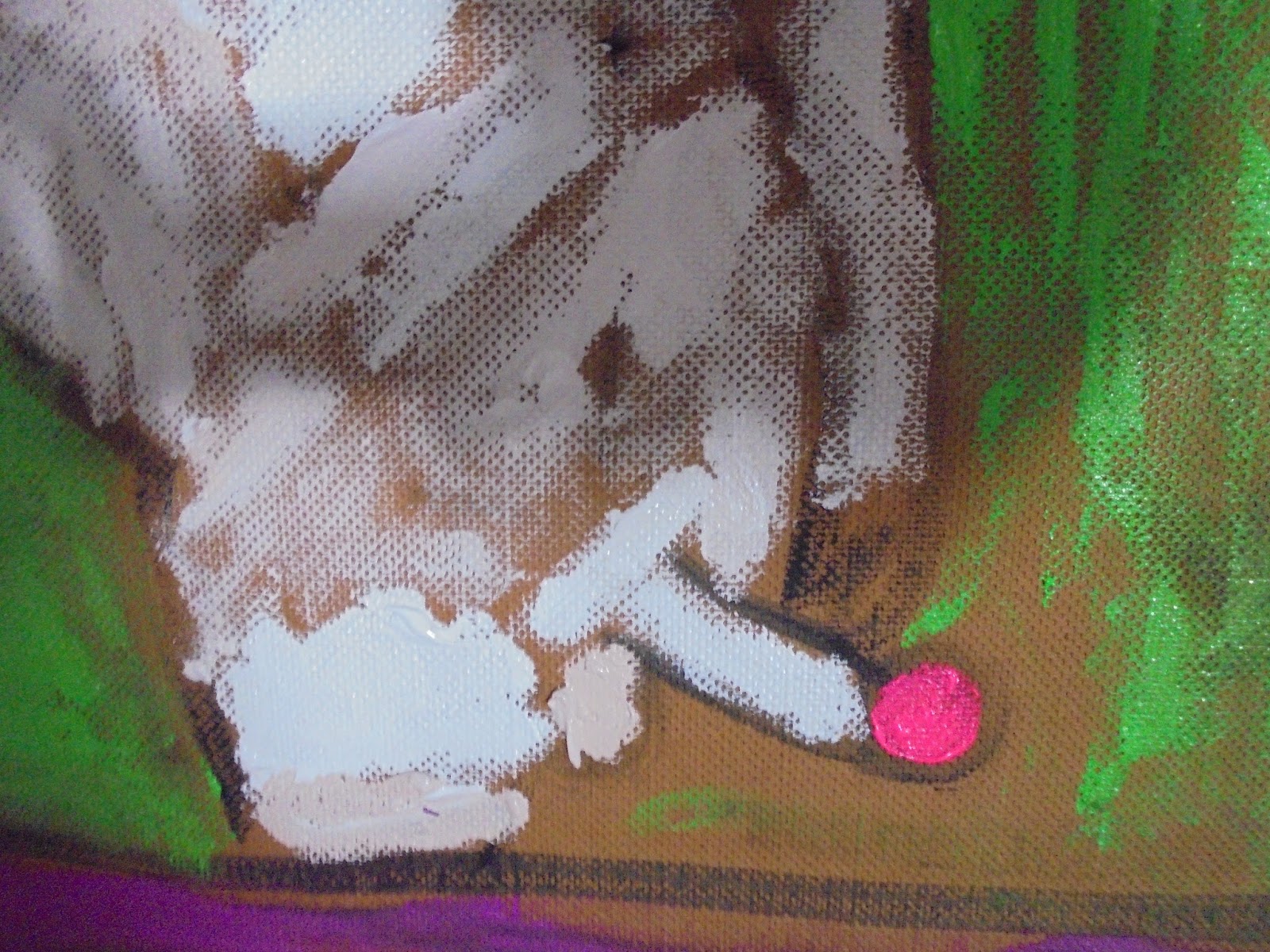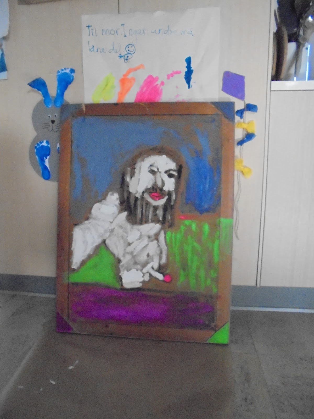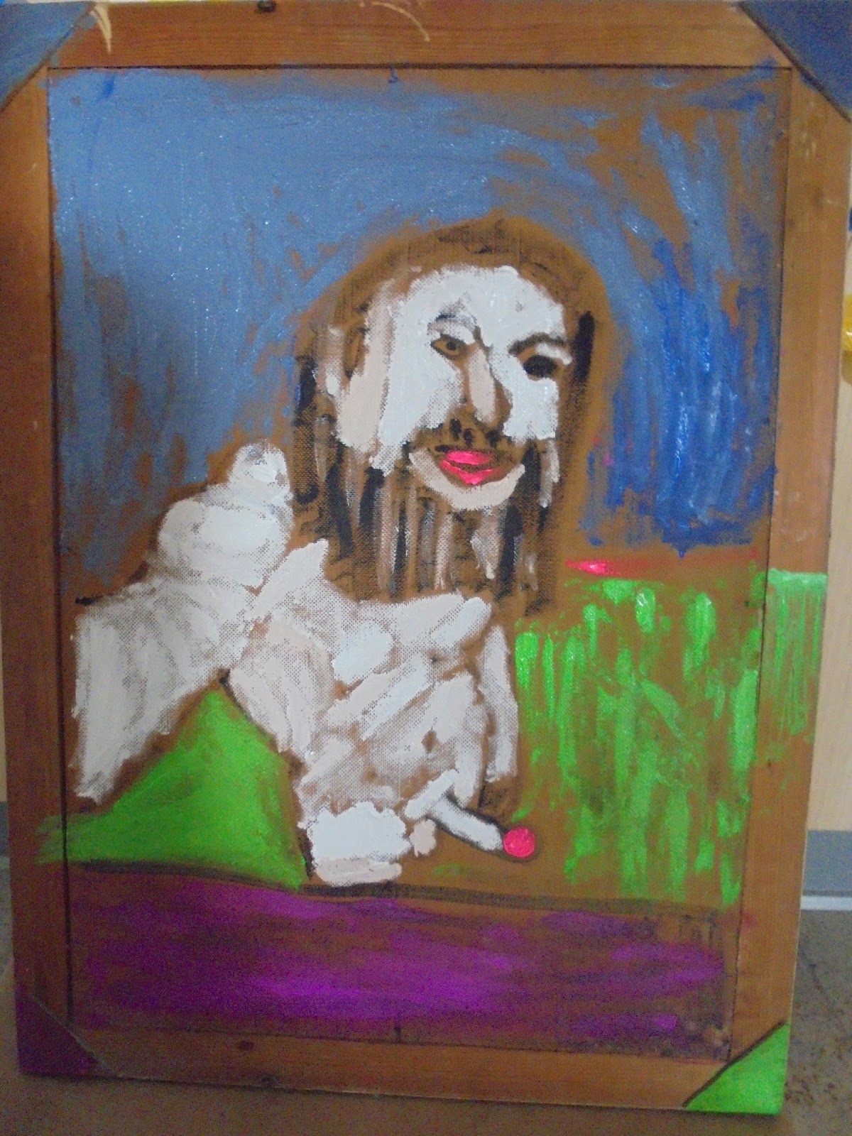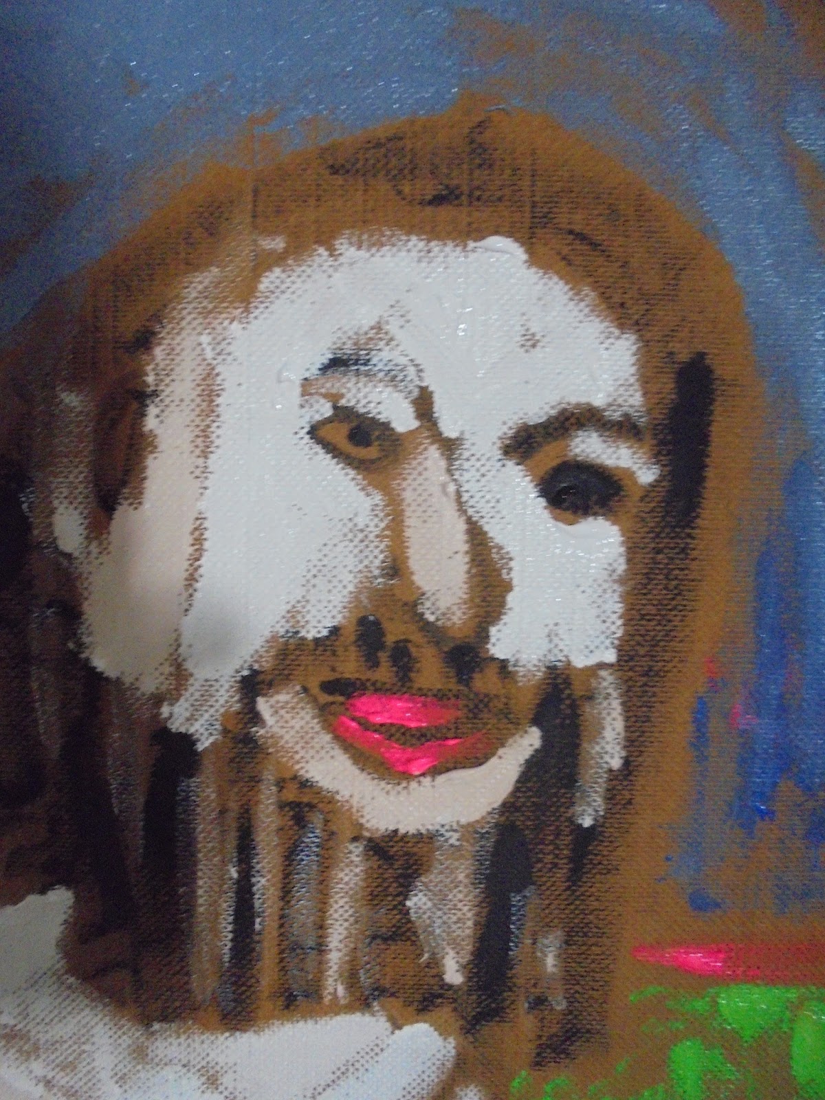 $ 0 0 Diogenes. Fællesværk af Asger Trier Engberg og Uwe Max Jensen. Akryl på masonit. 2016.Maleriet forestiller vores gode ven Jakob Nielsen.Se også Dan Park i Congo (negrenes hævn / Cannibal Holocaust)